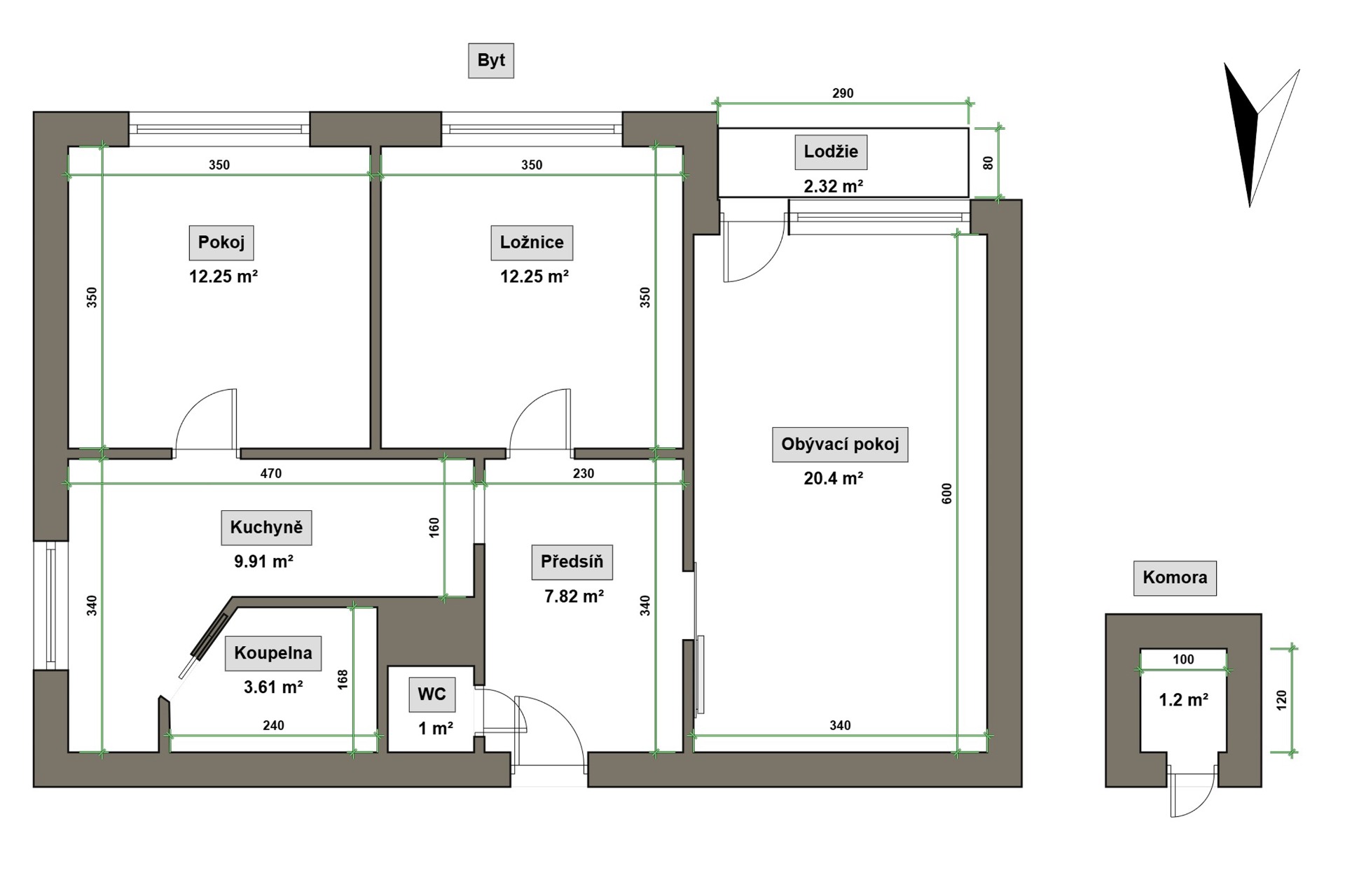 • celková plocha bytu cca 69 m² + ( plocha lodžie 2,5m², plocha komory 1.2m² a klep 2m²)