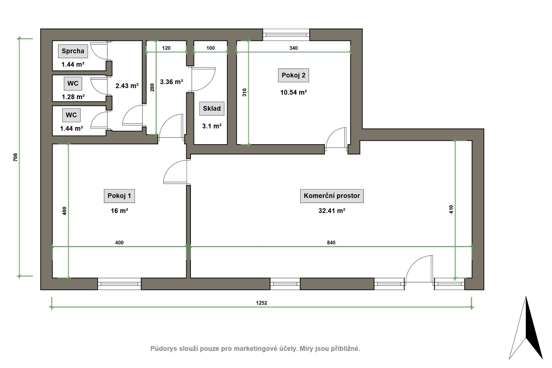 Prostor je vhodný pro kanceláře, služby, showroom, studio nebo lehkou obchodní činnost. Dispozice nabízí jednu hlavní otevřenou místnost + další dva nebytové prostory (sklad, sociální zařízení, 3x WC, sprchový kout). Velkou výhodou je možnost úprav dle potřeb nájemce (vše dle přiloženého půdorysu).